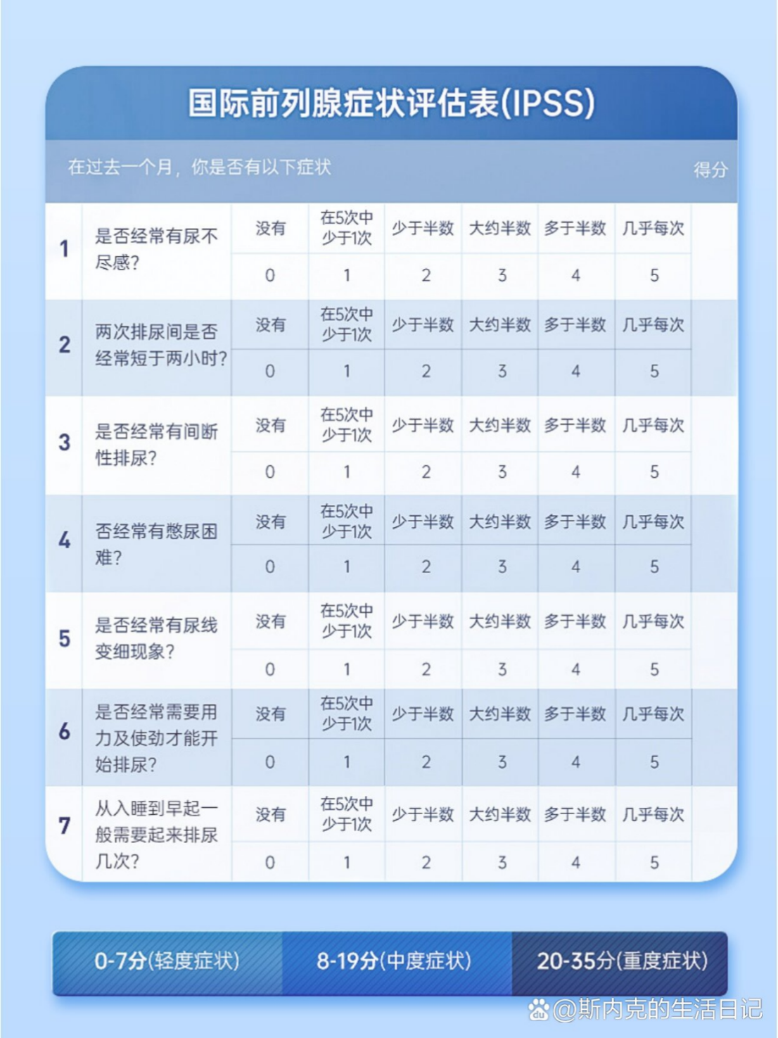 7)国际前列腺症状评分(IPSS):可以对前列腺增生的症状严重程度进行量化,有助于患者和医生直观的了解前列腺增生症的严重程度和分级,并观察评价治疗的效果。建议患者采取多次自测的方式,可以根据评分表的问题,平时观察体会自己的前列腺增生症状;