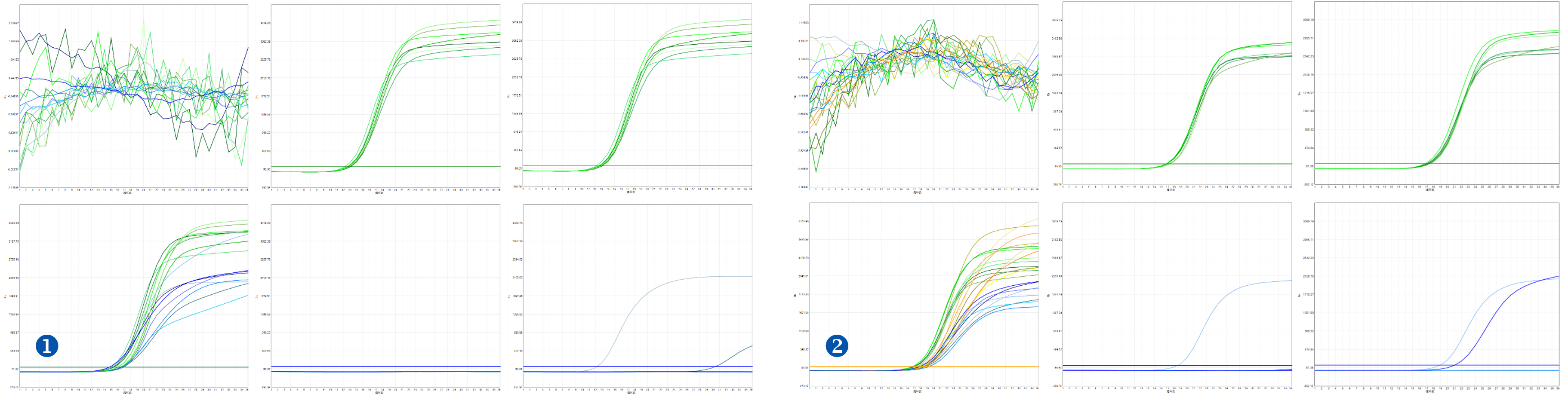 图1. 肺癌11基因检测之RNA融合基因:左上为阴性对照;左下为阳性对照;中、右上为HEX内控;中下为样本阴性,右下为样本阳性,MET基因融合阳性。图2. 肺癌11基因之DNA突变基因:左上为阴性质控;左下为阳性质控;中上、下为样本阴性,未见突变;右上、下为样本阳性,EGFR 19del突变。